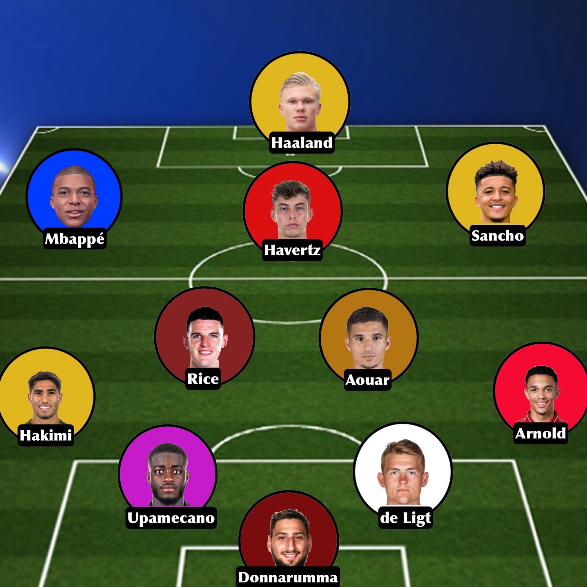 La squadra si presenta con il modulo offensivo "4-2-4" con il giovane tedesco Havertz a supportare i due calciatori del Dortmund (Sancho e Haaland) e la stella del PSG, Kylian Mbappé.